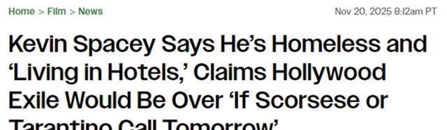 史派西曾经风光无限,但因性侵案失业8年后,他不仅事业跌入谷底,还称连基本生活都难以为继:由于财务状况不佳,他位于巴尔的摩的住宅被拍卖了。 现在, 他说自己无家可归,住在酒店里,却依然声称“如果(大导演)马丁·斯科塞斯或昆汀·塔伦蒂诺明天打电话来”,他的好莱坞流亡生活就会结束。 史派西在自己的好莱坞电影生涯因各种性侵指控而崩溃后,努力尝试复出,今年9月正式复出,亮相威尼斯电影节。 他在最新的媒体采访里强调自己无家可归,却还是乐观地认为自己能够东山再起。