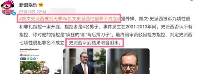 2022年10月,美国方面的陪审团裁定斯派西在安东尼·拉普的性侵诉讼中无罪。庭审中,拉普的证词出现多处矛盾,他陈述的自身年龄在14岁到19岁之间多次变更,且缺乏任何第三方证据。 更大的转折发生在2023年7月,英国方面的陪审团宣布对斯派西的九项性侵指控全部不成立。 判决的关键证据是:其中一名原告声称在某次派对上遭到侵犯,斯派西的律师则提供了确凿的电话记录,证明事发时他根本不在该国。 听到判决时,斯派西在法庭上泪流满面,他在庭外发表声明,称这是“对真相的证明”。